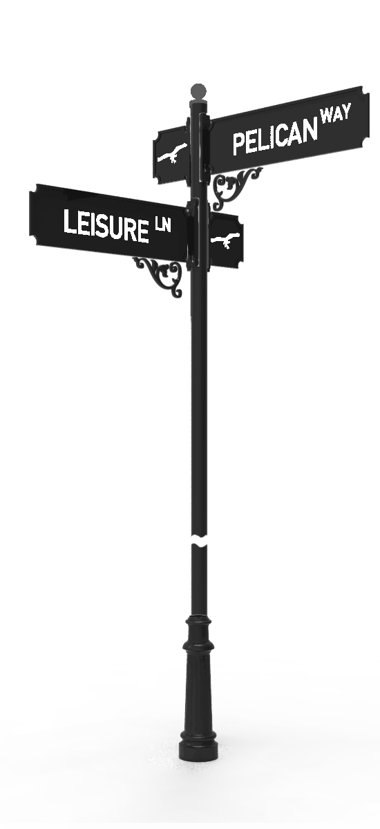 Custom street sign frames are the way to go for any community looking to add charm to their neighborhood. This Signature Series street sign design comes with chamfered corners, bringing a refined look to any curb. The addition of regulatory signs, such as stop signs, speed limit signs, and warning signs are also available in matching frames. Complimentary decorative bases, post finials, and scrolls can be accommodated to further personalize each unit.